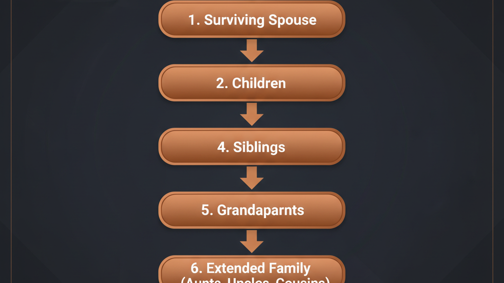- The intestate succession hierarchy runs from spouse and children to parents, siblings, grandparents, and extended relatives before the state claims anything.